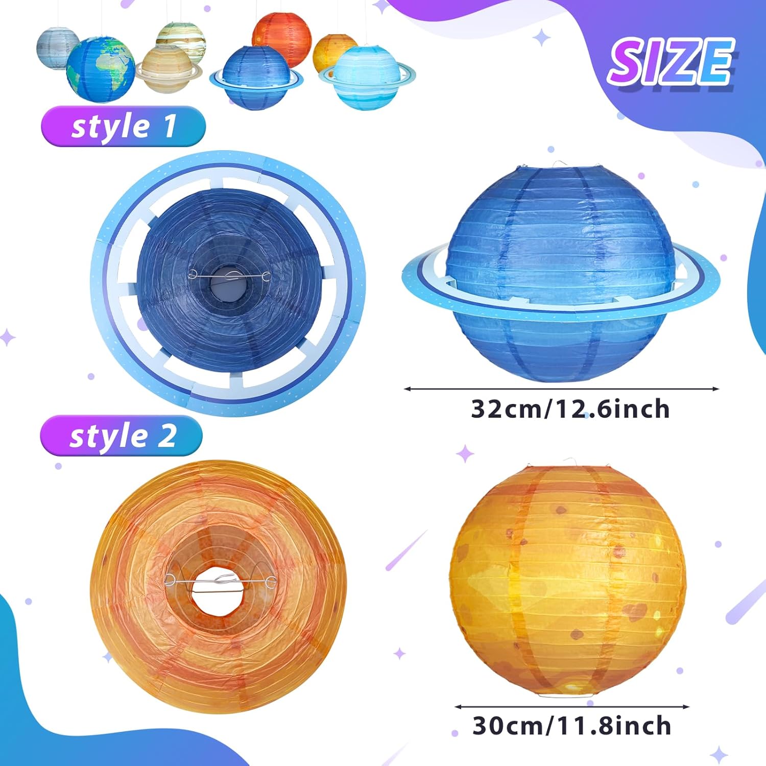 - SIZE AND MATERIAL: Each planet paper lantern is about 12 inch. And the planet-shaped neon light is 11.8 inches long and 6.7 inches high. They are made of great materials.