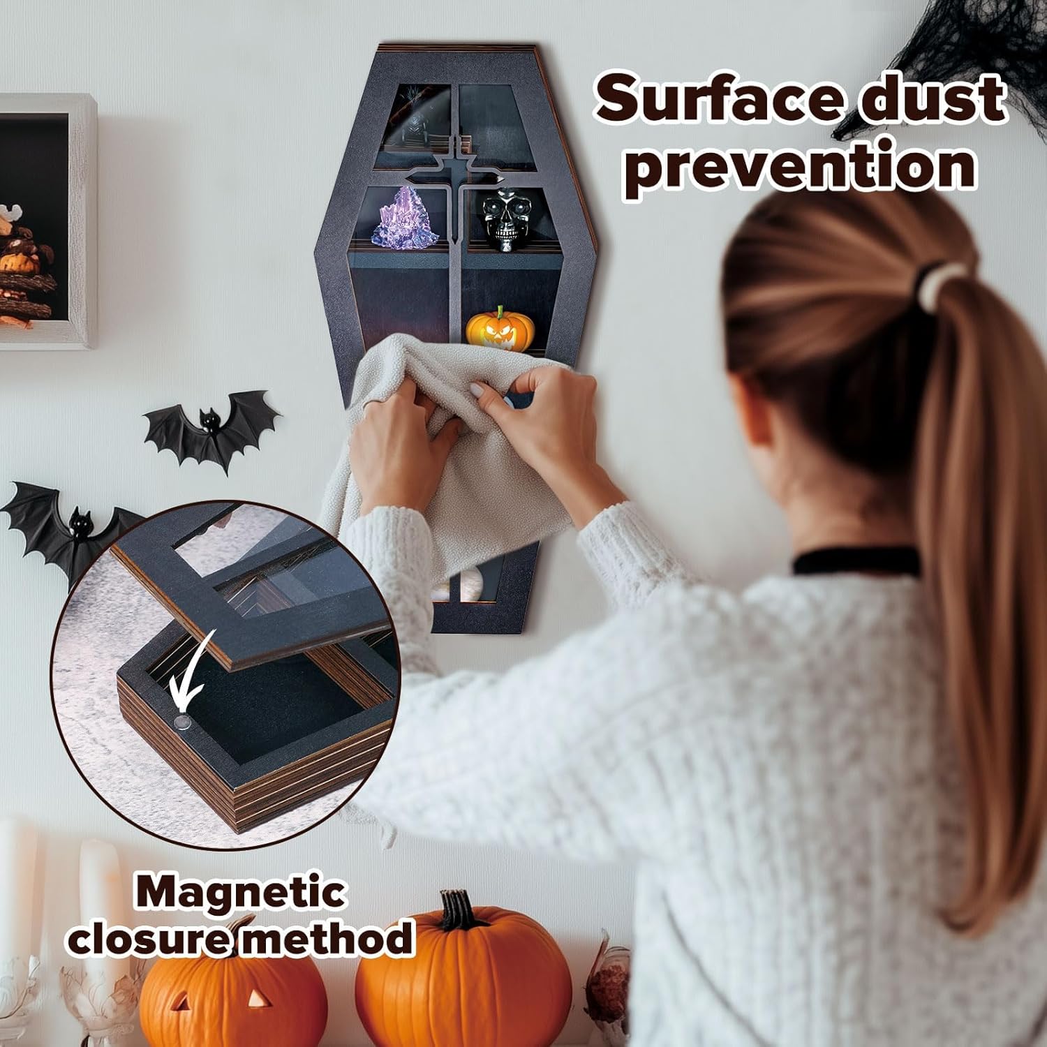 • Multi-Functional Design for Versatile Use: This coffin shelf is designed to adapt to a variety of settings, offering both wall-mounted and tabletop placement options. Whether hung as a striking wall decor piece or placed as an elegant centerpiece on a table, it seamlessly integrates into living rooms, bedrooms, study rooms, or even offices. Its versatile design ensures it meets diverse display needs while enhancing the aesthetic appeal of any space. A space-saving solution that combines functionality with style, perfect for users seeking a multi-purpose display option.