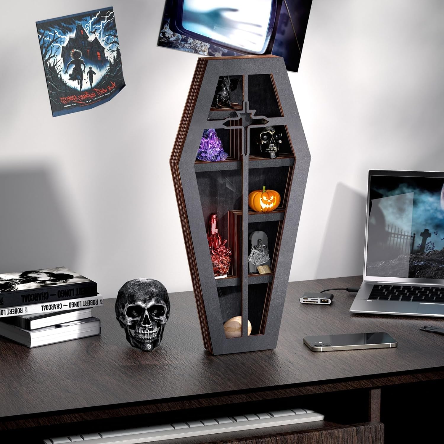 • Unique Design, Showcasing Personality and Art: The coffin-shaped design, complemented by intricate cross cut-outs, exudes a sense of mystery and cultural depth. This distinctive aesthetic transforms the display shelf into more than just a functional item—it becomes a captivating piece of art. Its unique appearance not only draws attention but also reflects the owner's individuality and sophisticated taste, making it a conversation starter in any setting. A bold, artistic statement that appeals to those who value unconventional and personalized home decor.