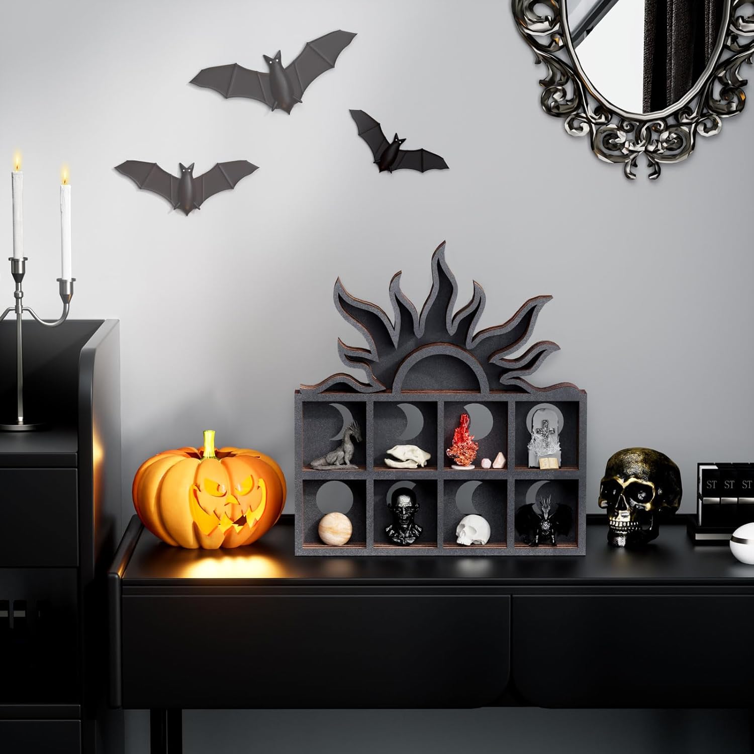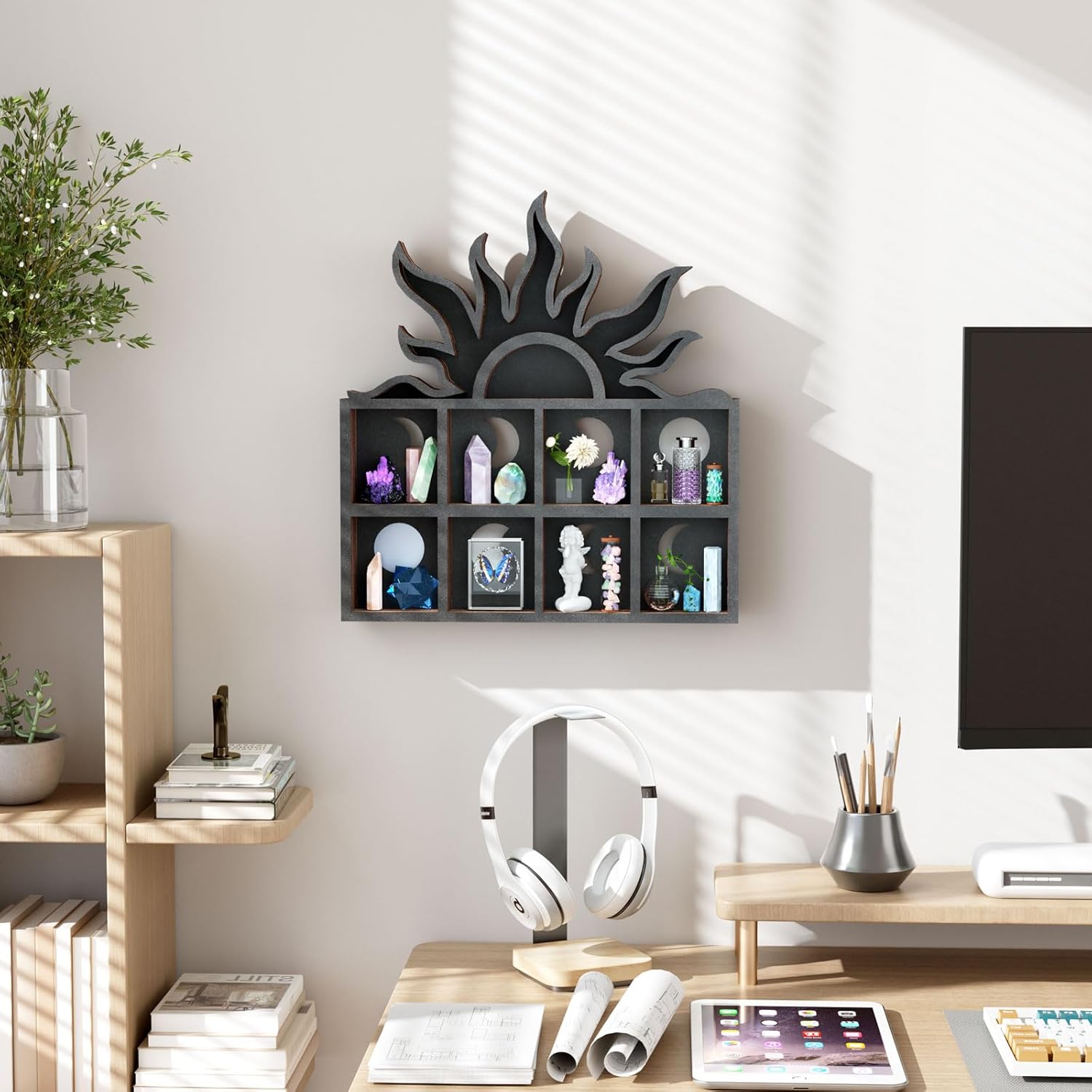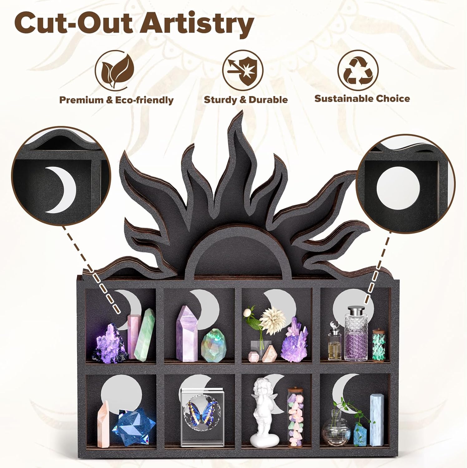 - Sunrise Art for Your Home: Showcase your crystals on a sunrise-shaped stand with moon-phase cutouts—where function meets artistry. This statement piece highlights your unique style and sparks conversation, perfect for those who crave bold, personalized décor. Add Gothic charm!