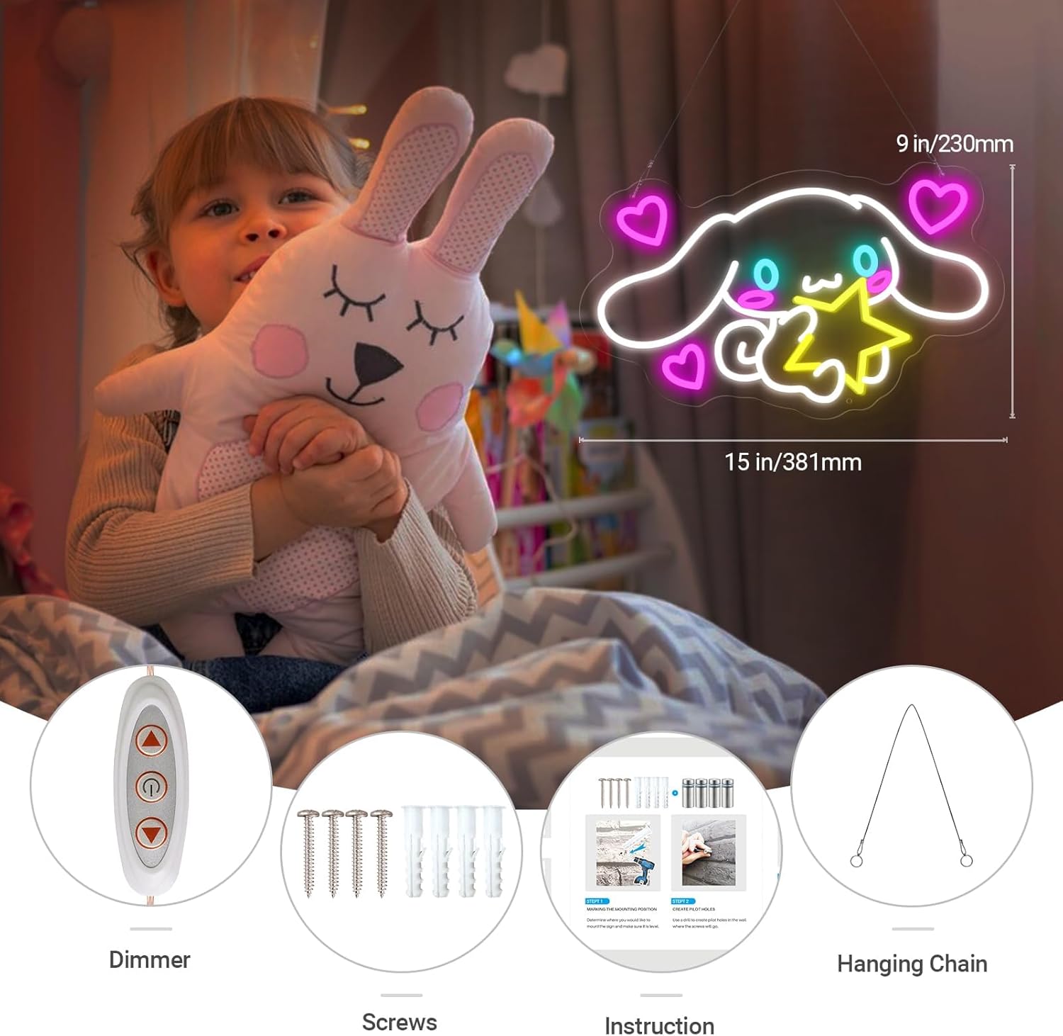 - ๐ธ NO HASSLE USE: Every cinnamoroll neon sign comes with pre-drilled holes and hanging chain, it's super easy to hang/mount on a wall or just place it on the table, desk, shelf as nightstand. Switch on with the dimmer included to experience a magical ambiance, which alllows you to adjust brightness freely. The memory function makes your lighting settings the same as the last time you used it.:)